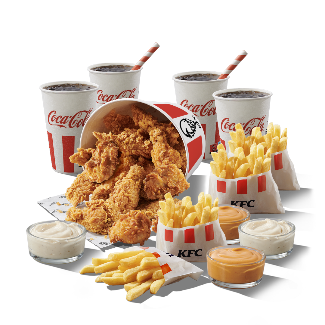 Winter Bucket for 4 12 KFC Nuggets, 8 chicken strips (original recipe), 8 hot wings, 4 S drinks, 4 S fries, 4 dips CONTAINS 12 KFC Nuggets 8 Chicken Strips 8 Hot Wings 4x Small Fries 4x Dips DRINKS 4x Coca-Cola Coca-Cola Zero Sprite Fanta
